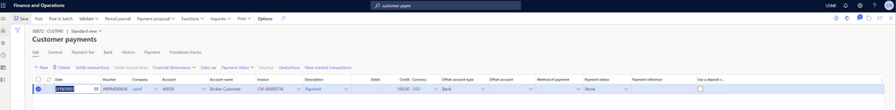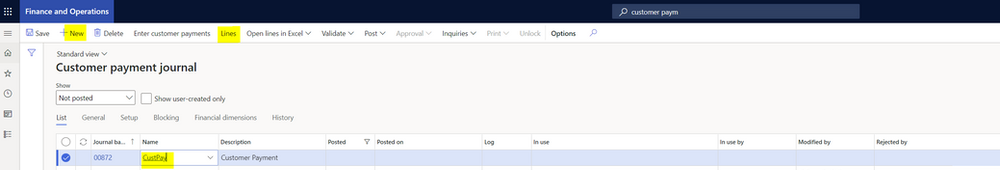 After creating the journal we add lines for the above invoice, settle the transaction and post.