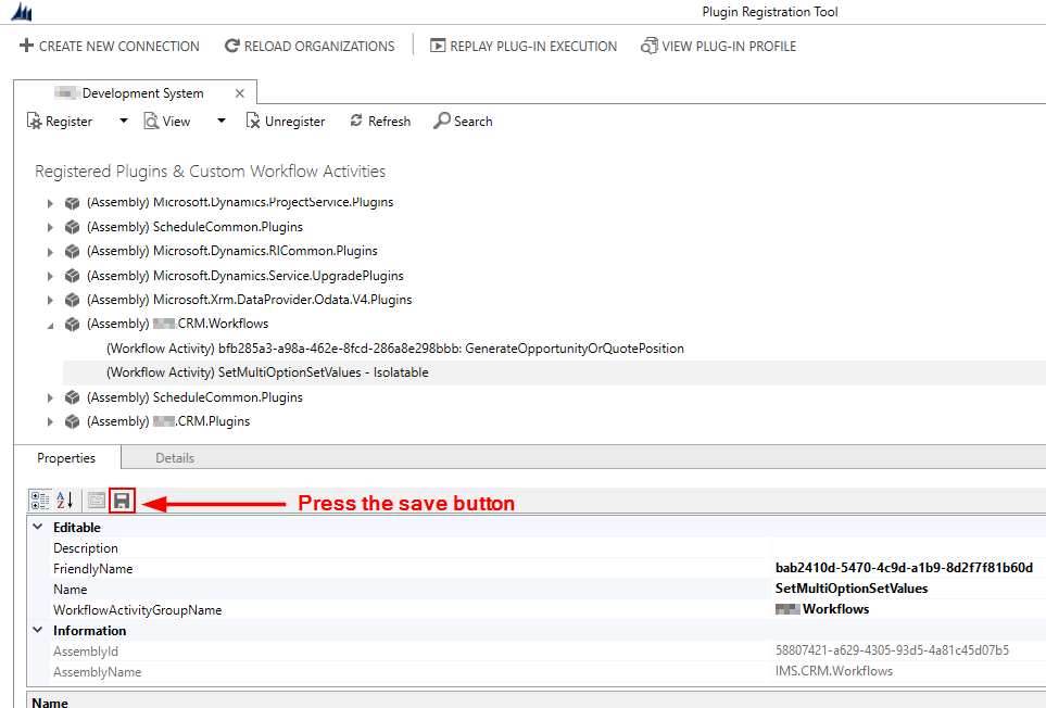 In the Plugin Registration Tool select the workflow activity that you want to update and press the save button in the properties section.