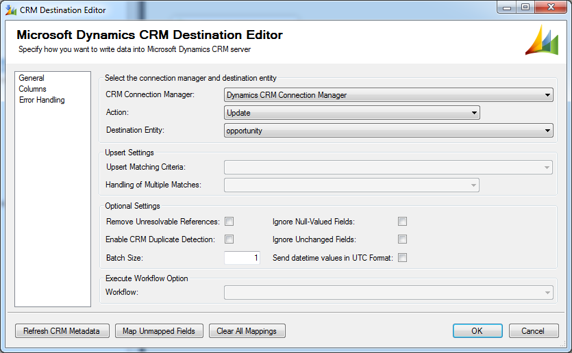 Configure connection to CRM, choose action, entity and map fields for update: