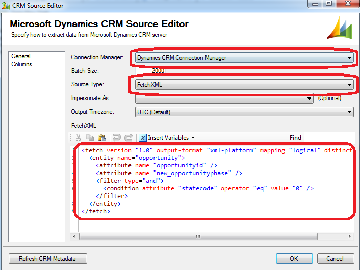Configure connection to CRM and choose clause that would be used for data fetching (in my case I used Fetch Xml) – select field-pk of records would want to update and fields based on which you will decide with what stage particular record would be updated:
