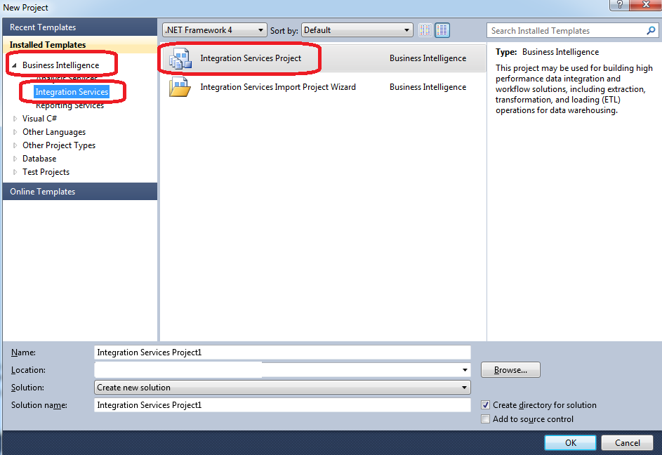 Open Visual Studio and Create “Integration Services Project”: