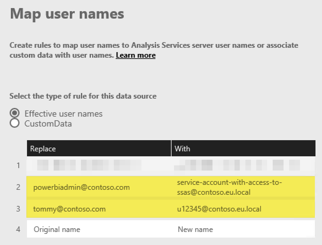 Notice in my example I am replacing the long username for the powerbiadmin@contoso.com with service-account-with-access-to-ssas@contoso.eu.local. So anytime I am logged in at the PowerBI portal with this powerbiadmin-user, and I try to access the data sources through the gateway, the user principal names will be "washed" through the mapping, and "magically" the credentials for that user will work On-Premise because the local domain sees a user it recognizes. Furthermore, I added another example of a user who locally is represented by u12345@contoso.eu.local, while in Azure AD is actually tommy@contoso.com. So if this user also tries to update or refresh data sources, the credentials will work locally.