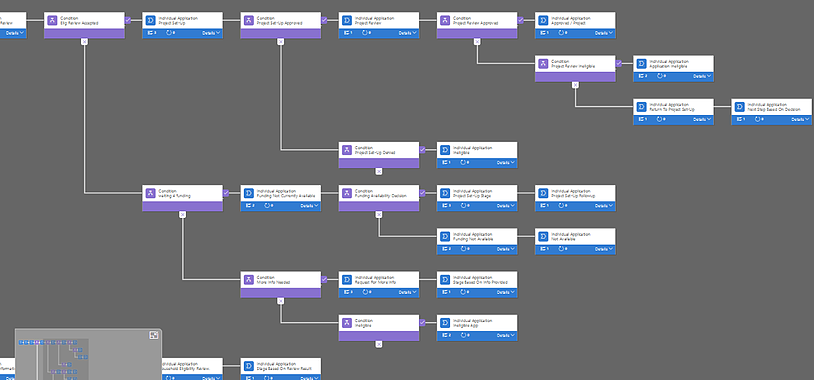 For example, Completeness Review stage (3rd box from the top), can lead to Household Eligibility Review or Request for Additional Info. This latter stage can create a closed loop by sending the process back to Completeness Review stage. The challenge in implementing this flow is that once the BPF flow is forked, you cannot continue from the forked branch to the main branch - a run-time error will result. In another example, if we imagine ‘Completeness’->’Household Eligibility’->’Project Set-up’ as the main branch of the process (as it belongs to a happy branch that can lead to an approval), if we go to ‘Request for Info’ fork in the BPF, there is no built-in way to go to ’Household Eligibility’ after that. If you look at the BPF designer, the fork is created using a condition:  |