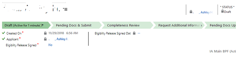 To avoid potential confusion between looking at the field value and the BPF area, map the record status values to BPF stages. The main data element displayed in a BPF’s stage is a decision field which drives the flow to the next stage. This is strictly speaking not necessary for linear flows but the decision field is helpful to serve as an indicator of an acceptance of the current state and an additional audit mechanism  |