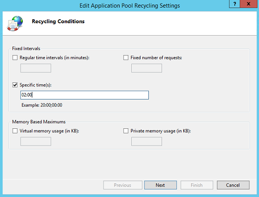 - In the recycling settings, uncheck the box marked with "regular time intervals (in minutes)". This is the default IIS setting, which means the application pool will recycle every 29 hours. You probably don't want the application pool to recycle in the middle of the work day, and that will eventually happen with an odd-numbered time interval. I prefer to set it at night, maybe 2 or 3 AM. Just make sure you're not gonna have any integrations depending on the CRM Web Services running at the same time. Rock on through and complete the wizard.