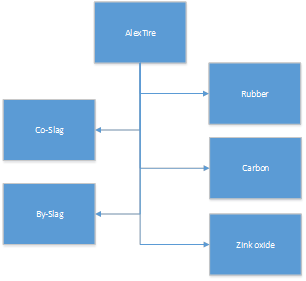 For Car tire (AlexTire) manufacturing we will need the following ingredients: Rubber, Carbon and Zink oxide. Please note that as the result of Car tire (AlexTire) manufacturing we will also have Co-Slag co-product and By-Slag by-product.