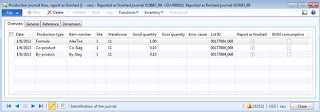 Report as finished Report as finished amount is 75$ based on standard cost of Car tire (AlexTire) *Inventory transactions Inventory receipt transactions for Car tire (AlexTire) will be displayed on Voucher transactions screen for Report as finished *Voucher transactions <Empty voucher> Please note that 75$ is standard cost of Car tire (AlexTire) Report as finished (Co-product) Report as finished amount is 0.10$ based on standard cost of Co-Slag co-product *Inventory transactions Inventory receipt transactions for Co-Slag co-product will be displayed on Voucher transactions screen for Report as finished *Voucher transactions <Empty voucher> Please note that 0.10$ is standard cost of Co-Slag co-product Report as finished (By-product) Please note that By-Slag by-product will add to the cost of finished goods and co-products and Report as finished amount for By-Slag by-product by itself is 0 (Zero) *Inventory transactions Inventory receipt transactions for By-Slag by-product will be displayed on Voucher transactions screen for Report as finished *Voucher transactions <Empty voucher> |