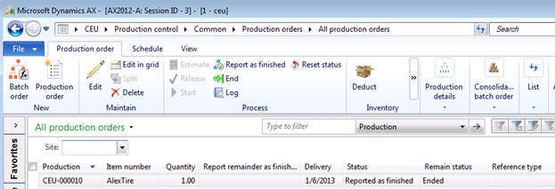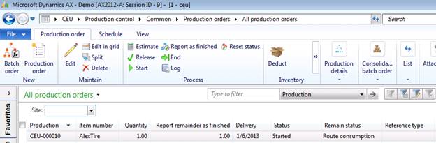 At this moment the system physically updated issue inventory transactions for Car tire (AlexTire) Formula ingredients. By other words ingredients for Car tire (AlexTire) have been used in production process