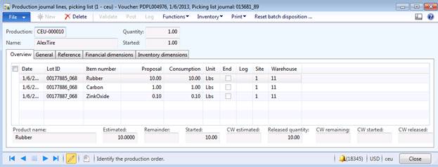 Picking list journal lines have details of what ingredients have been picked for Car tire (AlexTire) production