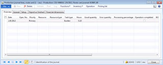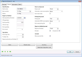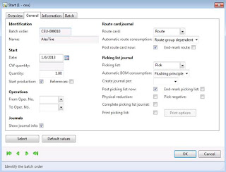 In this case I’ll pre-flush materials and labor consumption which means that material and labor consumption will be posted up-front. Please notice “Post picking list now” and “Post route card now” checkboxes which are marked. I assume that there’s enough on-hand for the ingredients to be consumed