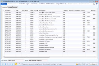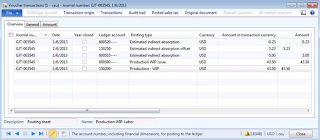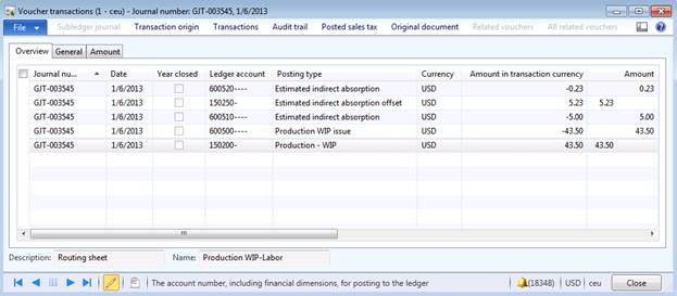 Material consumption Material consumption is 39$ based on cost of Car tire (AlexTire) Formula ingredients *Inventory transactions Inventory issue transactions for Car tire (AlexTire) Formula ingredients will be displayed on Voucher transactions screen for material consumption *Voucher transactions Ledger voucher provides details on which account was credited for “Production, picking list”, which account was debited for “Production offset picking list” as well as on additional postings happened because of material overhead applied Route consumption Route consumption is 43.5$ based on cost of operations for Process and per Quantity for Car tire (AlexTire) *Inventory transactions Inventory receipt transaction for Car tire (AlexTire) will be displayed on Voucher transactions screen for route consumption *Voucher transactions Ledger voucher provides details on which account was credited for “Production WIP issue”, which account was debited for “Production - WIP” as well as on additional postings happened because of labor overhead applied *Route transactions Route transactions show the details of labor consumption postings for Process jobs (37.50$) and per Quantity (6$) which rolls up to 43.50$ Indirect cost Indirect cost 5.23$ represents labor overhead applied to labor consumption based on Costing sheet setup. Please note that plant overhead is calculated based on labor overhead and contributes to the sum *Inventory transactions Inventory receipt transactions for Car tire (AlexTire) will be displayed on Voucher transactions screen for indirect cost *Voucher transactions Ledger voucher provides details on which account was credited for “Estimated indirect absorption”, which account was debited for “Estimated indirect absorption offset” in regards with labor overhead applied *Indirect cost transactions Indirect cost transactions provide information regarding the breakdown of indirect costs incurred which are related to labor consumption according to cost groups set up in Costing sheet Indirect cost Indirect cost 0.79$ represents material overhead applied to material consumption based on Costing sheet setup. Please note that plant overhead is calculated based on material overhead and contributes to the sum *Inventory transactions Inventory receipt transactions for Car tire (AlexTire) will be displayed on Voucher transactions screen for indirect cost *Voucher transactions Ledger voucher provides details on which account was credited for “Estimated indirect absorption”, which account was debited for “Estimated indirect absorption offset” in regards with material overhead applied *Indirect cost transactions Indirect cost transactions provide information regarding the breakdown of indirect costs incurred which are related to material consumption according to cost groups set up in Costing sheet |