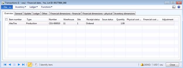 At this moment we only have 1 inventory transaction representing batch order receipt for Car tire (AlexTire)