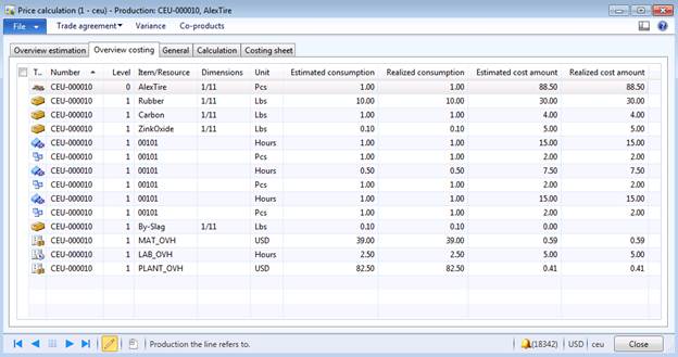 Please note that the system segregates consumption of materials from consumption of labor on Overview costing tab. Also different types of overhead costs are represented based on Costing sheet setup