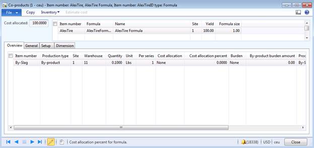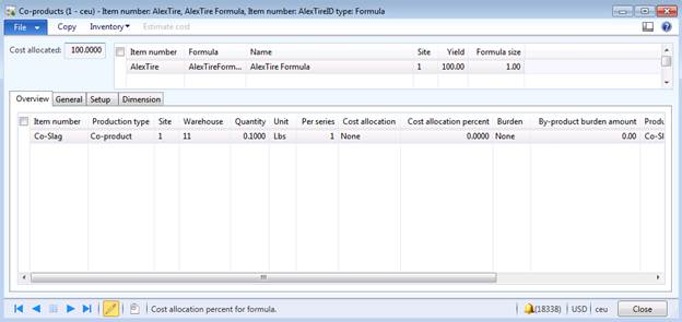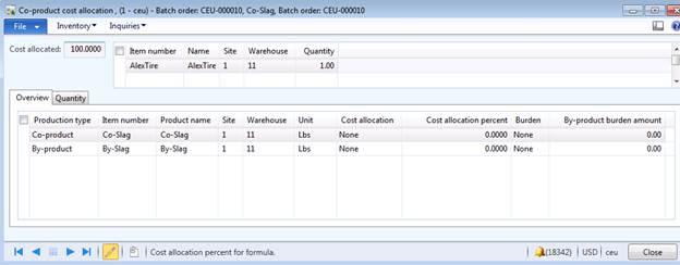 As the result Cost allocation percentages will be calculated for co-products. In this scenario Cost allocation percentage = 0.1332%