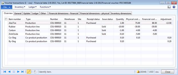 Please note that financial cost for Co-Slag co-product inventory receipt transaction is 44.25$ which equals to financial cost for Car tire (AlexTire) inventory receipt transaction