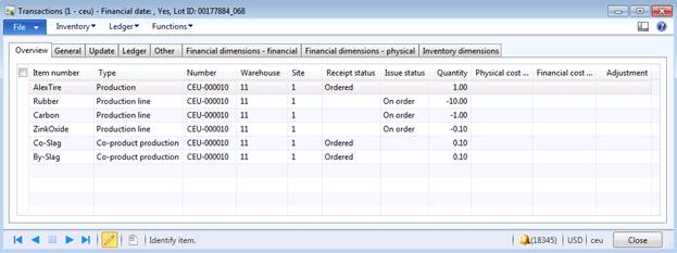 At this moment the system physically updated receipt inventory transaction for Car tire (AlexTire) as well as for Co-Slag co-product and By-Slag by-product. By other words Car tire (AlexTire) has been produced and is available now as well as secondary outcomes - co/by products: Co-Slag co-product and By-Slag by-product
