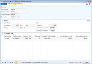 Based on TCA (Total cost allocation) principle the system calculates the cost as a weighted average between the quantities that are reported as finished for product and co-products. On Estimate cost screen you can calculate Cost allocation percentages for co-products using Allocate cost percentages function.