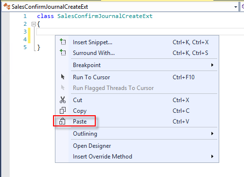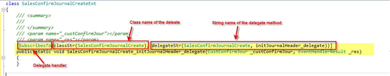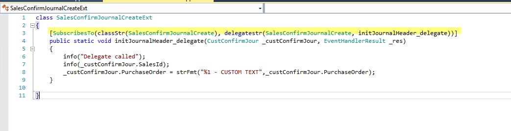 Create a new class which will be used to subscribe to the delegate. So we create a new class, let call is salesConfirmJournalExt and paste the copied clipboard text