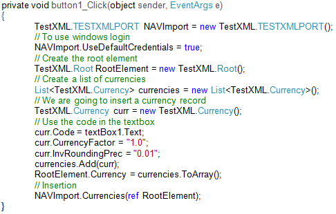 Now we are going to test it using Microsoft Visual Studio. Create a new Windows Form Application. Add a Web Reference to http://localhost:7047/DynamicsNAV/WS/TESTCOMPANY/Codeunit/TestXMLPort. Add a textbox and a button to the form and double-click the button. Add the following code to the button's on-click event.