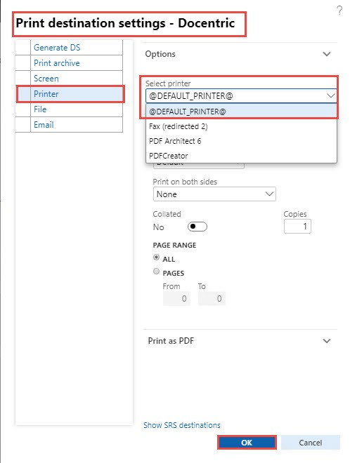 End-users often demand to print reports to their default printer in Dynamics 365 for Finance and Operations. Unfortunately, there is no such functionality in standard D365FO. If you take a look at Print destination settings, there is no option available to set up the default printer.