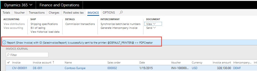 Let’s say that you want to print a Sales invoice report (Accounts receivable -> Inquiries and reports -> Invoices -> Invoice journal) to your default printer.