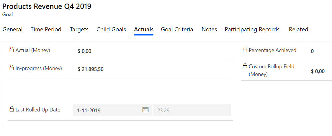 When the goal is (re)calculated the Actual Revenue is based on the product AssemblyMaestro 100 sales only.