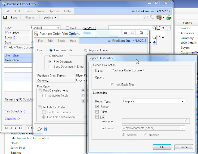 However, and as luck would have it, I could not create a new template based on the existing POP Purchase Order Blank Form in the Microsoft Dynamics GP dictionary, because the two reports use a slighly different data set - the PA alternate report uses additional fields and tables not used by the standard report - but that's a tale for another time. In the mean time, I hope you find this article useful.