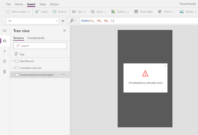 UpdateContext({recordCount: CountIf(Leads,emailaddress1 = emailAddress_1.Text)});If(recordCount > 0, Navigate(DiuplicateDetectionDialogBox,ScreenTransition.Fade))