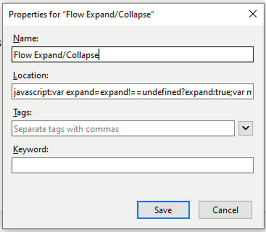 Here’s the complete code to add to a new Bookmarklet. I called mine “Flow Expand/Collapse”, and this can just be added to your bookmarks bar for your browser.