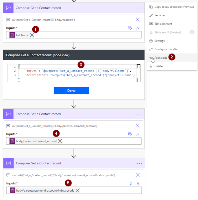 Below are examples of how to get the industrycode of the related Account in the Apply to each loop from the List Contact records action: