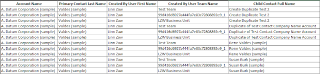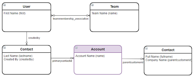 The following scenario is the combination of all examples above to query Account records together with the Last Name of the Primary Contact of Account, the First Name field of the Created By user and related Teams of the Contact entity and the full name of child Contact entities.