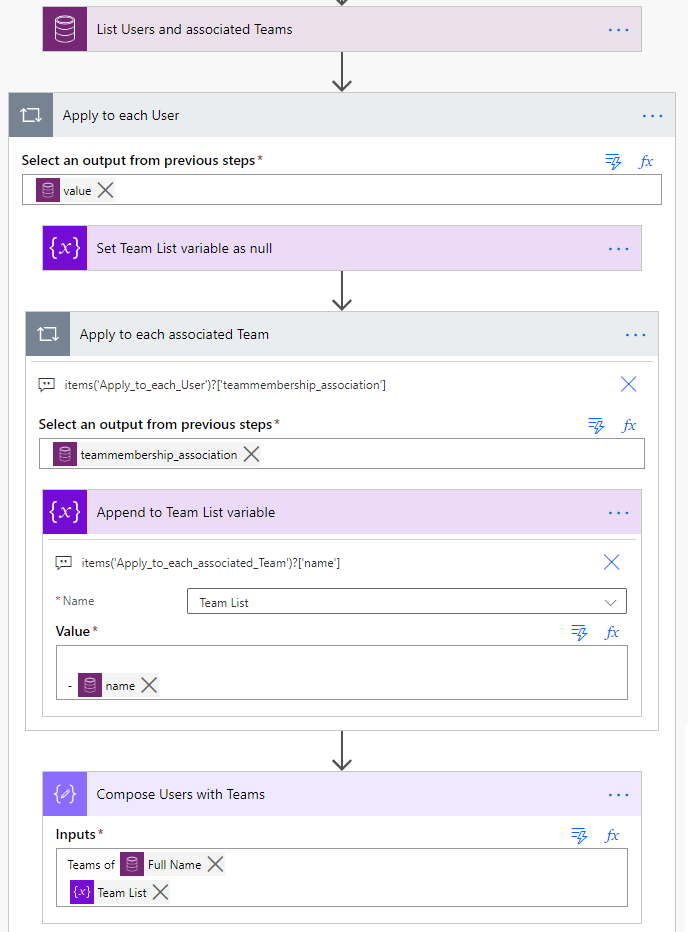Getting the value from the N:N related entity is pretty much similar to getting a value from 1:N related child entity. In the sample flow below, List Records action is used to retrieve the Users with associated Teams (pretty much similar to the previous example).