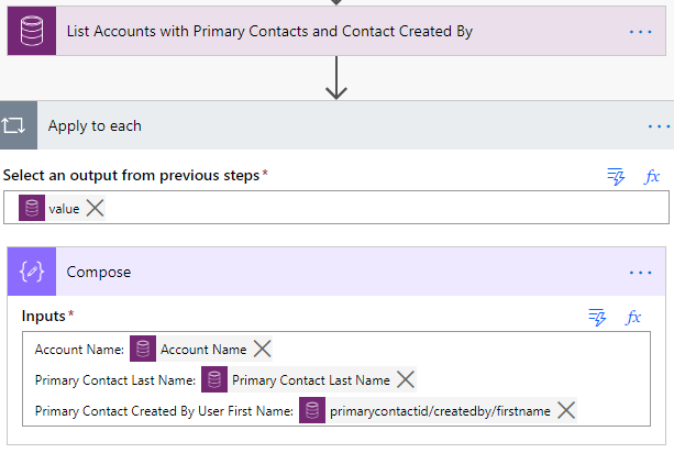 Primary Contact Created By User First Name: @{items('Apply_to_each')?['primarycontactid/createdby/firstname']}