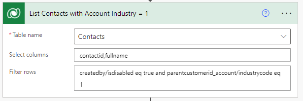 In the following List records action, the value of the Expand Query is "parentcustomerid_account($select=industrycode)" to retrieve the Industry of the Contact’s Company.
