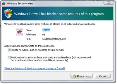 I then decided to check the SQL Server to confirm that the Windows Firewall was disabled. Alas, the firewall was enabled. Aha! When I turned off the firewall, sure enough, DTC Ping operated fine in both directions between the app and SQL server. And I also found that the option to "Notify me when Windows Firewall blocks a new program" was unchecked, which is why I didn't receive a dialog when DTCPing was blocked. When I enabled notifications, I received this message when I launched DTCPing.