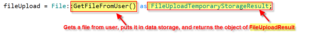 fileUpload = File::GetFileFromUser() as FileUploadTemporaryStorageResult;