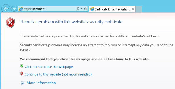 Click OK, then close, and from the right hand side just click the "Browse *:443 (https)" link to open up CRM with SSL encryption enabled. You will be presented with a warning screen which tells you that the certificate isn't trusted for this site, but that's OK because you just created this certificate yourself, and it's just for this purpose you're using it. Click on the red shield with the text "Continue to this website (not recommended)".