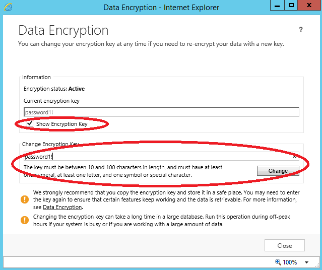 - Add the https-bindings to your CRM site in IIS as described in the backup steps, open up CRM and navigate to Settings -> Data Management -> Encryption. Enter the encryption key you've backed up in your password management system or similar.