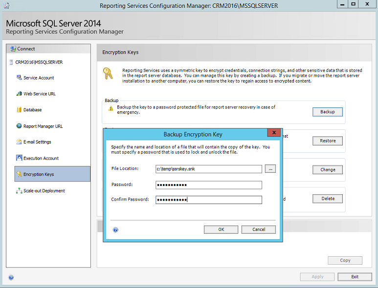 This isn't CRM! Well no, it isn't strictly CRM, but if you want to be able to restore your magnificent, custom tailored, beautiful SSRS reports then you might want to have the encryption key used by SSRS to connect to it's database. You only have to back this up whenever it changes, which typically is whenever you migrate to a new environment or set up a new SSRS-server, so there's no need to keep doing this on a regular schedule. You should do it atleast once, though.