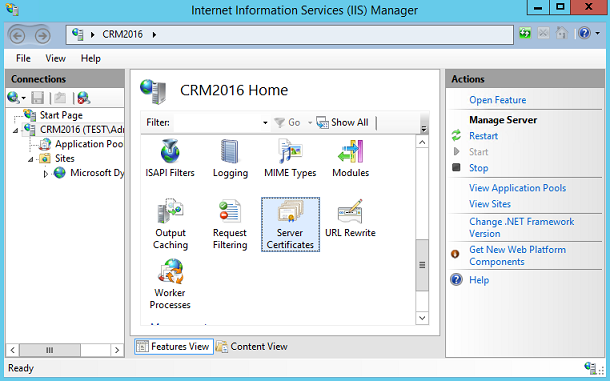 What you want to do add an additional binding to your CRM website, an HTTPS binding with a self-signed certificate. Head into Internet Information Services (IIS) and highlight the server, then open up Server Certificates from the home screen.