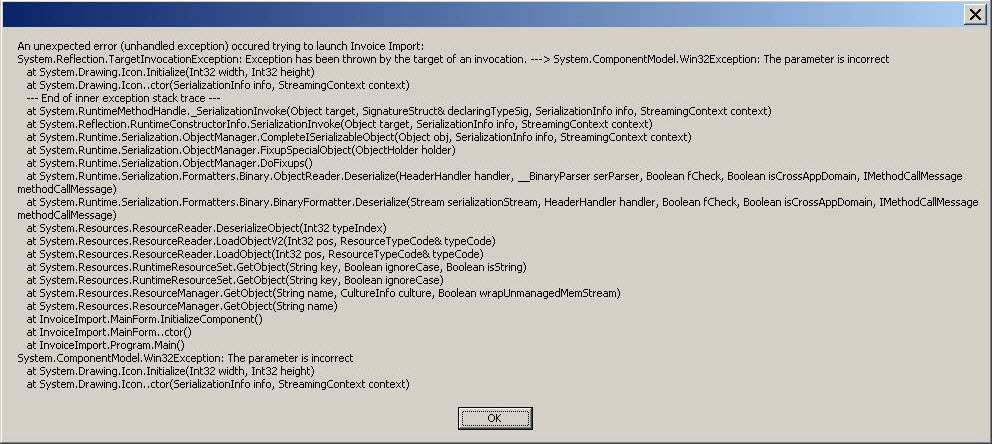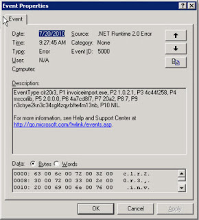 EventType clr20r3, P1 invoiceimport.exe, P2 1.0.2.0, P3 4c374d29, P4 mscorlib, P5 2.0.0.0....