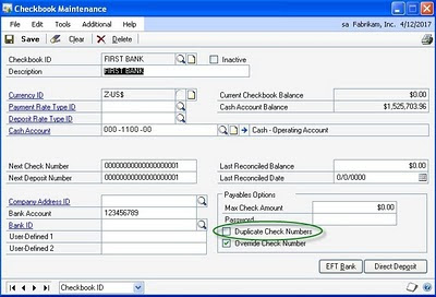2. Go back to the Checkbook Maintenance window and uncheck Duplicate Check Numbers.