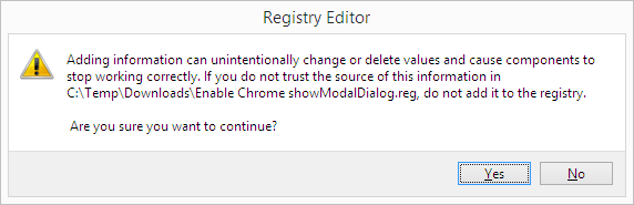 After the download is completed close Google Chrome, double-click the .reg file and click Yes to the Registry Editor prompt: