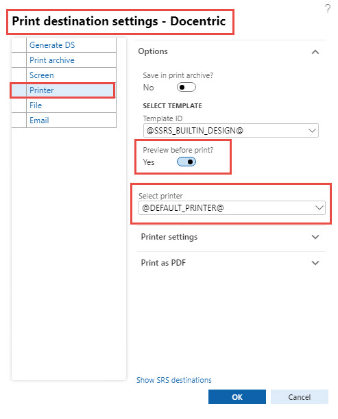 For previewing the report before printing, we need to set the same "Preview before printing" option as we did in the above section, but this time we need to set this option in Printer Section of the Docentric print destinations settings.