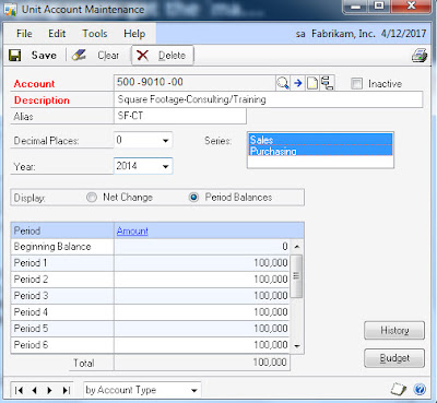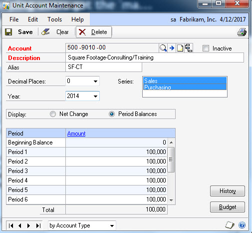 In this example, we've setup the square footage of the Consulting/Training department to use it in monthly utilities cost allocations. Note that the department covers 100,000 square feet and the amount doesn't change throughout the year. The 100,000 value was posted in Period 1 via the journal entry below.