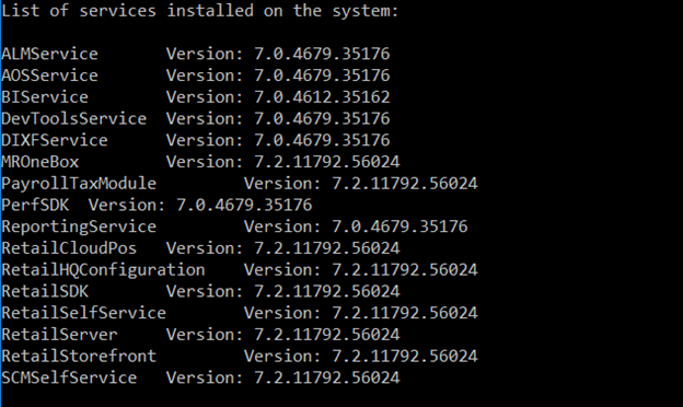 g. Open command prompt from the VM (as Admin), and then navigate to the Extracted folder to run the command AxUpdateInstaller.exe list (This will help to determine the components and their versions which are installed on your local dev box)