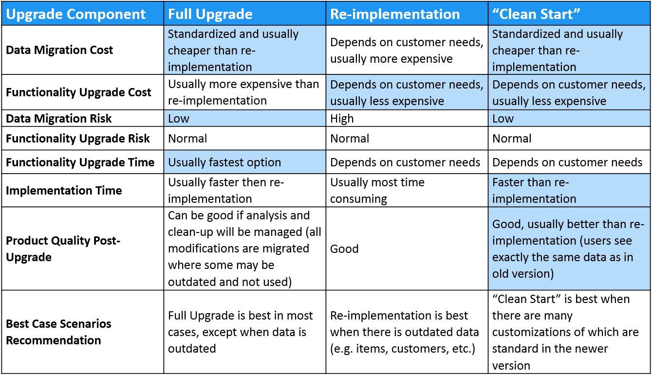 Let me share with you my view on how I separate and compare the three distinct upgrading models (Full Upgrade, Re-implementation and “Clean Start”) in the table below: