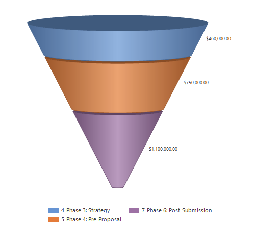 The most fundamental chart is the sales pipeline funnel. This is broken into the sales stages of your business process flow, such as unqualified, qualified, RFI, RFP, proposed and others.