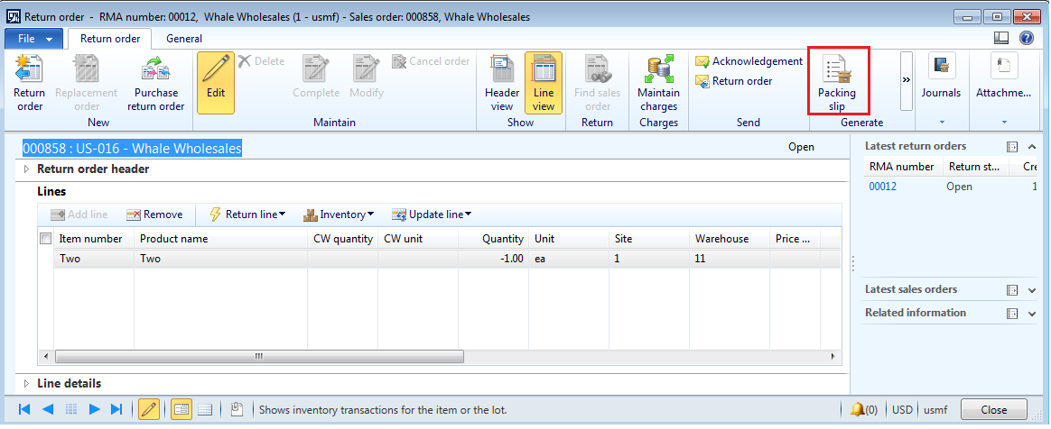 Note: Packing slip will get posted in the return order in order to register the financial impact of the received items in the system.