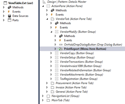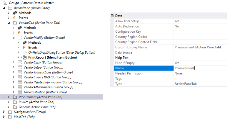 Exited and curious I head to test if it works on standard buttons and controls. Can I make the entire Procurement action pane tab disappear? Auto Declaration property on this tab is set to No, so it's a good candidate.